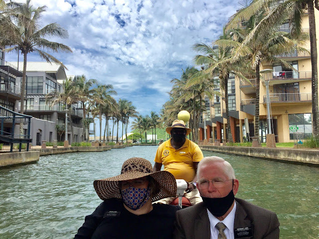 The canal is lined with beautiful new buildings that have businesses on the ground floor and apartments above. We had wanted to go back to the 415 Mexican restaurant (named for San Francisco phone area code) but it has permanently closed due to COVID. Sue found another Mexican restaurant about 5 km (3.4 miles) up the beach from downtown Durban. President Lines suggested we go there for lunch one day and find out if it was an OK neighborhood to visit for dinner. (Some places are not.) It was beautiful, delicious, and quite safe. It's is part of Sun Coast Hotel/Casino/Mall complex. You have to go through a security guard to get into the parking lot, and you do not have to go through the casino to get to the restaurants. Perfect!